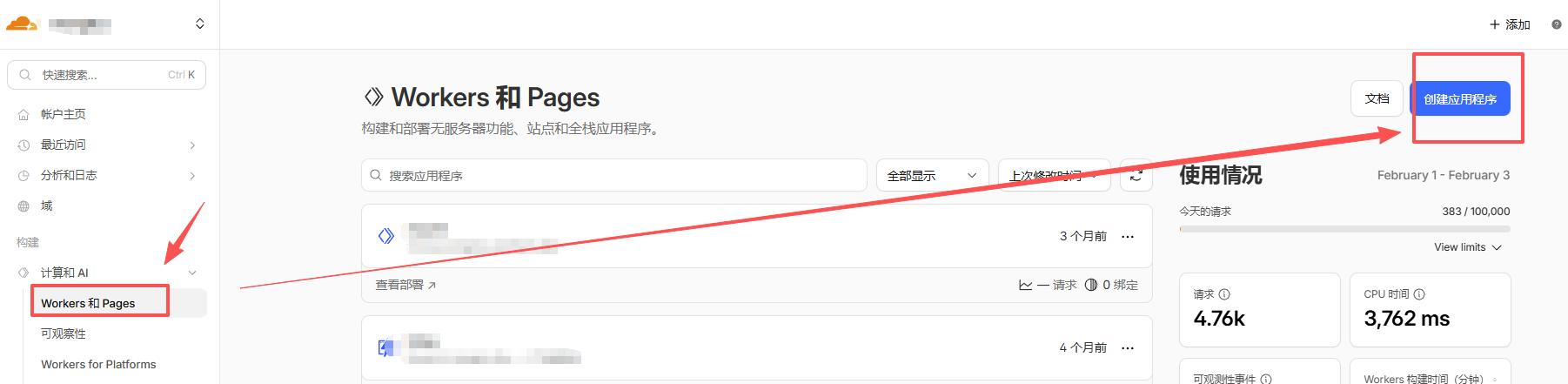 1、找到 Workers和Pages 选项,创建一个应用程序